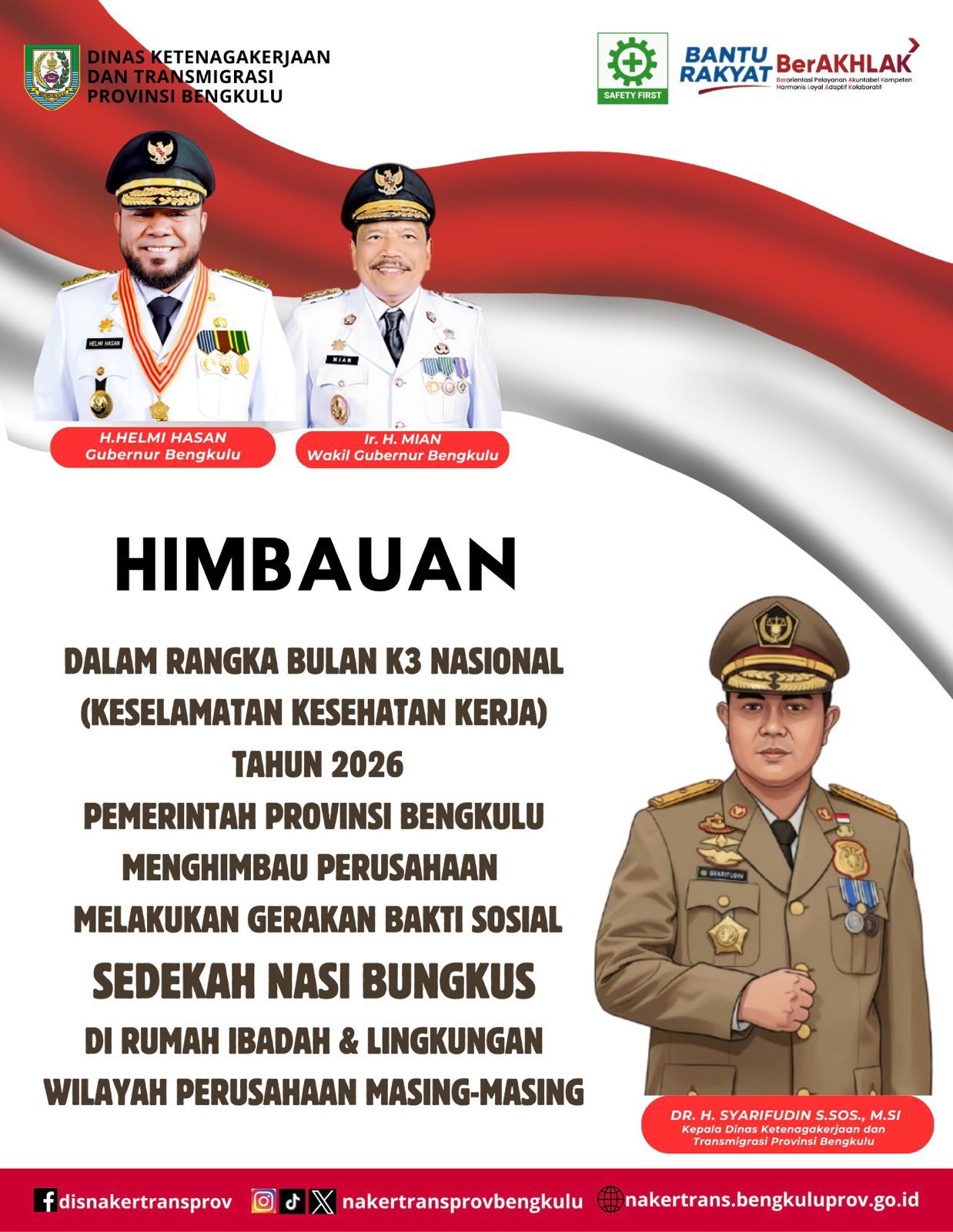 Dalam rangka Bulan K3 Nasional Tahun 2026, Pemerintah Provinsi Bengkulu mengimbau perusahaan melaksanakan gerakan bakti sosial berupa sedekah nasi bungkus yang disalurkan ke rumah ibadah dan lingkungan sekitar perusahaan, ujar Syarifudin di Bengkulu, Jumat (23/1/2026).