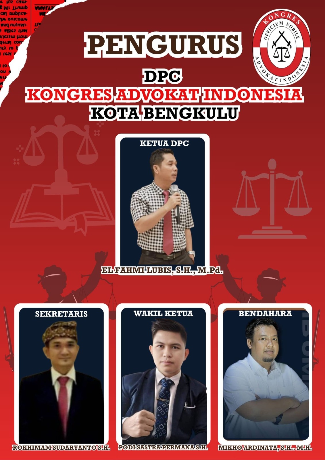Kota Bengkulu – DPC Kongres Advokat Indonesia (KAI) Kota Bengkulu dan Bengkulu Tengah, kini telah memiliki nakhoda baru. Ditunjuk sebagai Ketua DPC adalah Advokat Elfahmi Lubis, S.H., M.Pd., C.Med., C.PArbiter. Sementara itu sebagai Wakil Ketua Advokat Pody Sastra Permana, S.H., CLD, Sekretaris Advokat Rokhimam Sudaryanto, S.H, dan Bendahara Advokat Mikho Adinata, S.H., M.H.