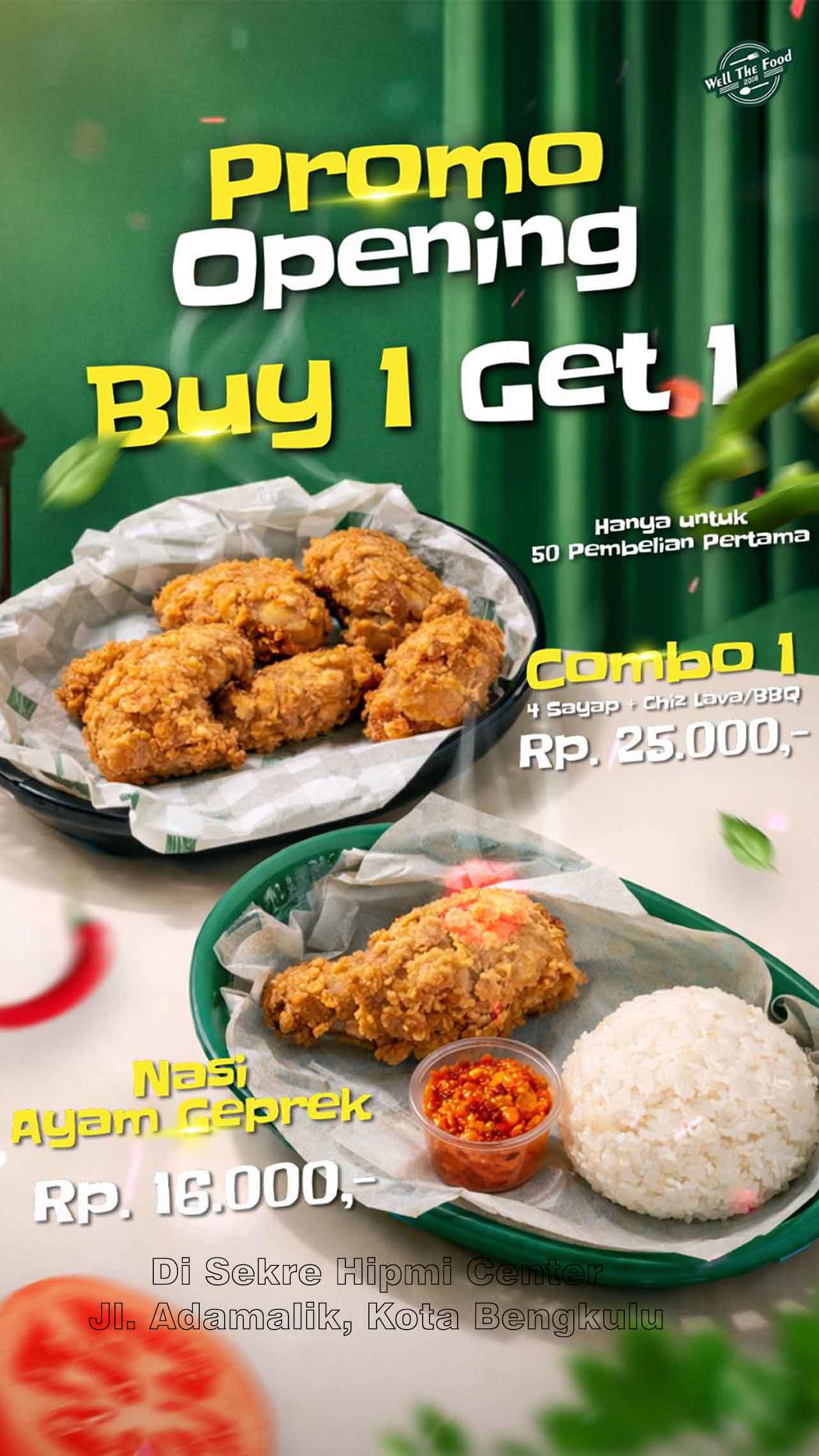 Dalam rangka grand opening, Well The Food menghadirkan promo spesial Buy 1 Get 1 Free yang berlaku sehari penuh. Promo ini hanya bisa dinikmati oleh 50 pembeli pertama, sehingga sejak pagi antrean pengunjung sudah terlihat di lokasi. Penawaran ini menjadi daya tarik utama sekaligus bentuk apresiasi kepada masyarakat Bengkulu yang mendukung ekspansi bisnis kuliner tersebut.